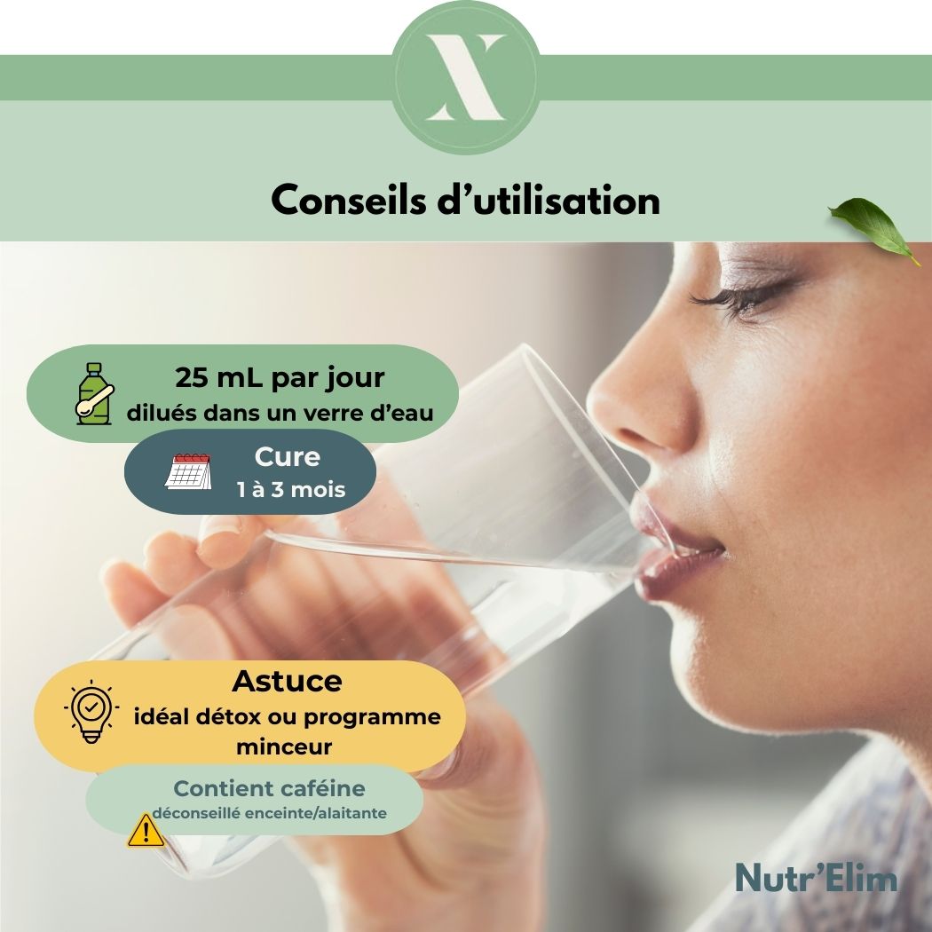 Il est déconseillé de consommer Nutr’Elim à jeun, notamment en raison de sa teneur en extrait de thé vert et en guarana (caféine naturelle).