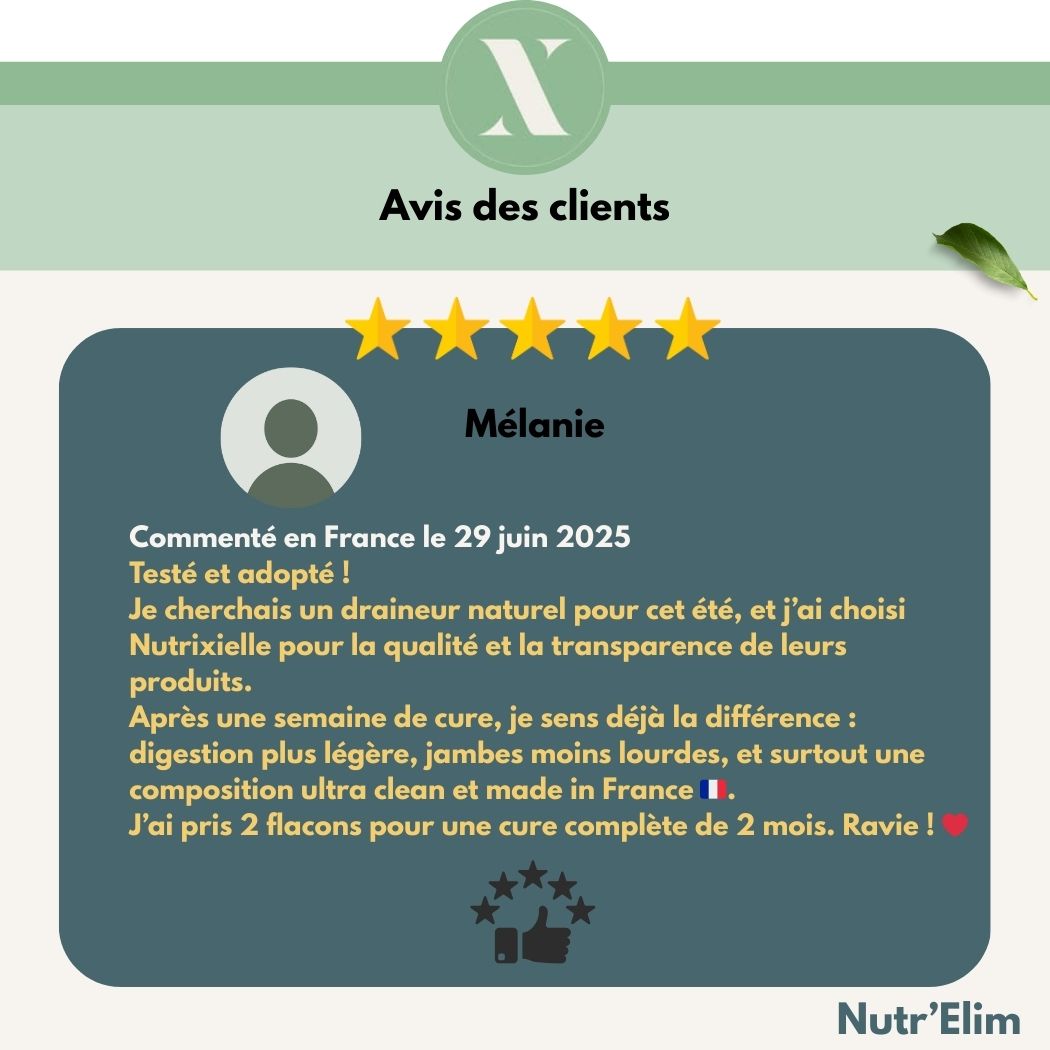 Je cherchais un draineur naturel pour cet été, et j’ai choisi Nutrixielle pour la qualité et la transparence de leurs produits.
